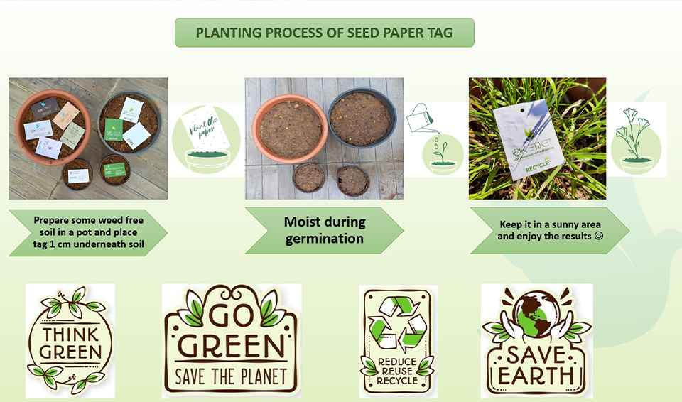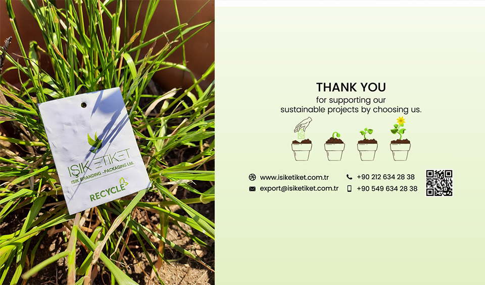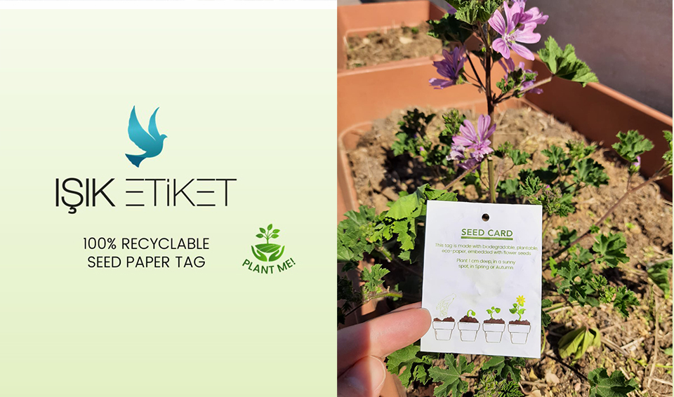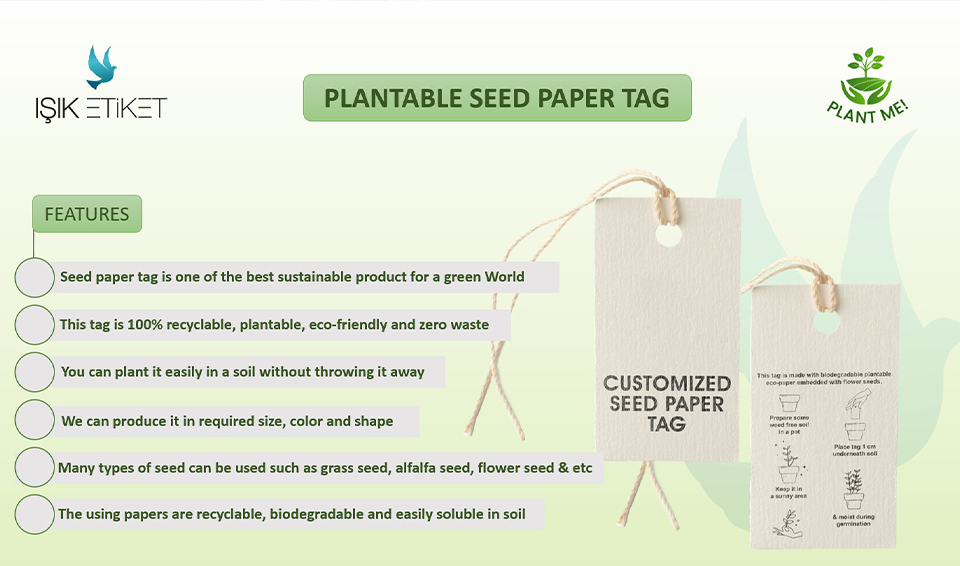 Tohumlu karton etiketlerimiz yeşil bir dünya için sürdürülebilir, %100 doğa dostu, ekolojik ve sıfır atık bir üründür. Geri dönüşümlü kağıt kullanılarak ve belirli tohum çeşidi eklenerek, talep ve ihtiyaçlarınıza göre istenilen ölçü, renk ve şekilde üretilebilmektedir. Tohumlu karton etiketinizi çöpe atmadan kolaylıkla toprağa ekebilir, böylelikle çevre kirliliğini önleyerek sürdürülebilir bir gelecek için katkıda bulunabilirsiniz.